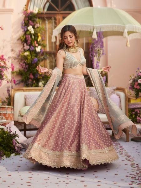 The Kasauli Lehenga Is A Refreshing Summer Piece Made In The Best Quality Net. Featuring Fine Needlework Bringing A Balance With Running Patterns, ???Ÿhighlighted With Subtle Floral Motifs, And Finished With A Double Lace Net Panel. The Blush Pink Net Lehenga Set Comes With The Delicate Net Dupatta Featuring Its Share Of Intricacy Adding To The Look And A Blouse Piece Designed With Floral Twines That Run Vertically.