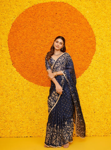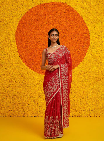 Step Into The Limelight With This Radiant Red Saree That Perfectly Captures The Essence Of Festive Opulence. The Rich Red Fabric Serves As A Vibrant Canvas For Intricate Silver And Gold Embroidery, With Delicate Floral Motifs Cascading Gracefully Across The Length Of The Saree. Tinybooti Embroidery Throughout, Adds A Touch Of Sparkle That Catches The Light With Every Step You Take. The Border Is Finely Detailed, Framing The Saree With A Subtle Yet Elegant Finish. Whether You'Re Attending A Wedding Or A Festive Celebration, This Saree Ensures You'Ll Make A Lasting Impression With Its Bold Color And Exquisite Details.