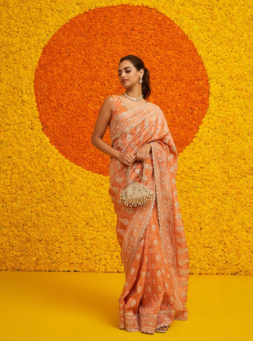 Step into the spotlight with this elegant saree, exuding a timeless charm. Executed in a rich, deep navy blue, this saree is adorned with intricate silver zari embroidery, forming delicate regal traditional motifs all along the fabric. The border features a detailed pattern that adds a regal touch to the overall design. Whether it's a grand celebration or an intimate gathering, this saree ensures you'll be the center of attention, radiating grace and poise.