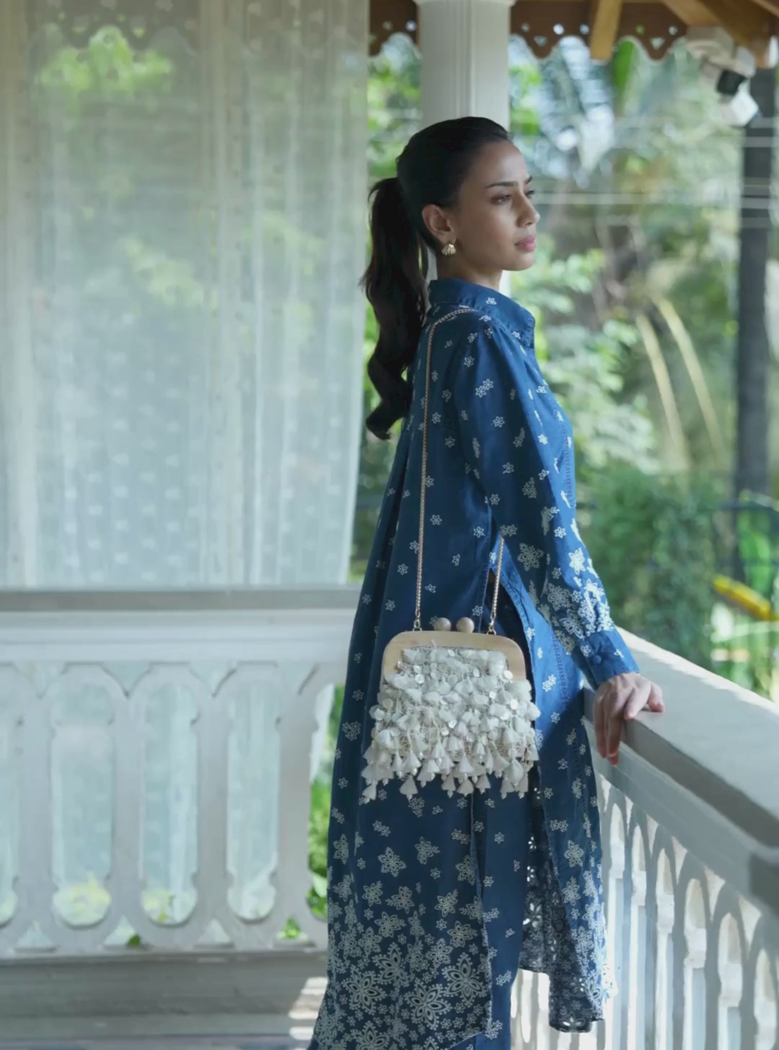 An A-line denim kurta set with a clean neckline and full sleeves, paired with straight pants. Features delicate motif placement with a heavier border towards the hem. Designed for all-day comfort—ideal for home poojas, family lunches, or small occasions.