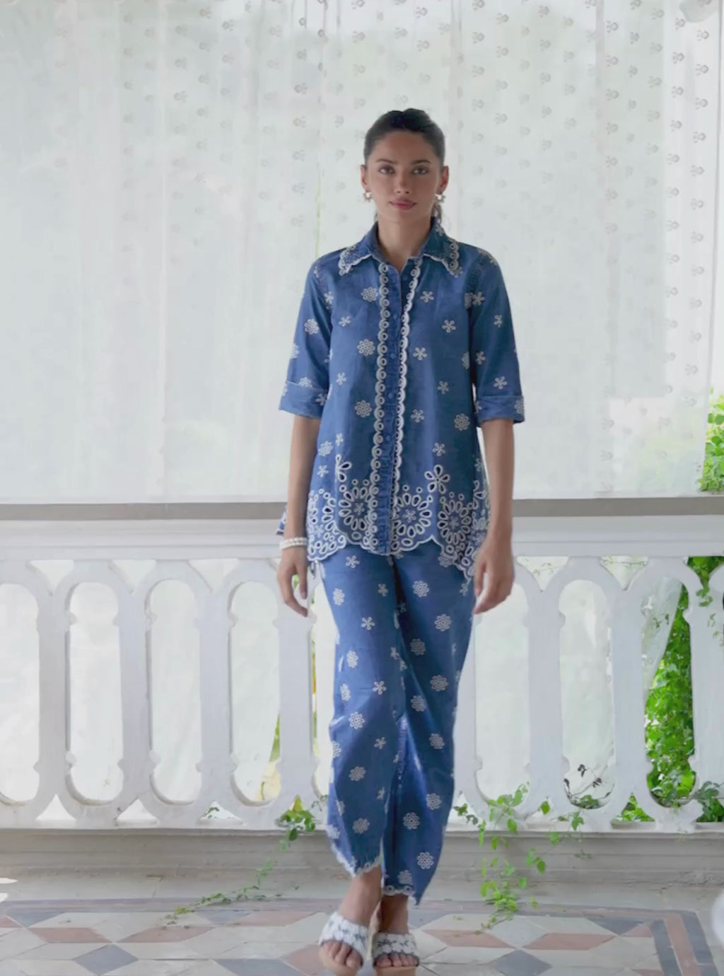 A button-down denim shirt paired with straight pants, both detailed with minimal motifs and a soft scalloped finish. The silhouette is relaxed yet put-together, making it a go-to for everyday wear, errands, or informal get-togethers.