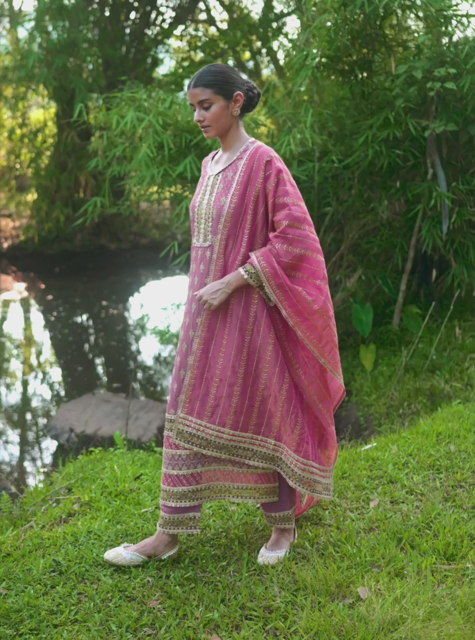 Draped in the hues of a blooming spring garden, this plum kurta set is an ode to timeless grace. The straight-cut kurta is adorned with intricate gold threadwork, exuding a rich, festive charm. A heavily embroidered yoke and ornate borders along the hemline add a regal touch, making this ensemble perfect for celebratory occasions. The three-quarter sleeves, detailed with delicate embellishments, enhance its understated sophistication.