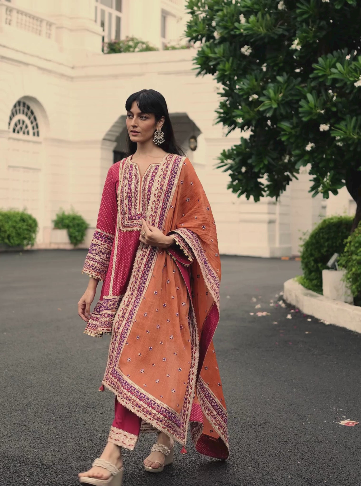 A vibrant ode to festive style, this short kurta set pairs rich hues with timeless craftsmanship. The straight-silhouette kurta in Banarsi coloured polka dot fabric features intricate woven detailing that reflects heritage artistry. Tailored pima satin pants add a refined finish, while the orange lurex-insert Utsavi dupatta brings a luminous pop of contrast. Perfect for wedding celebrations, cultural gatherings, and festive evenings, this ensemble blends tradition with contemporary charm.