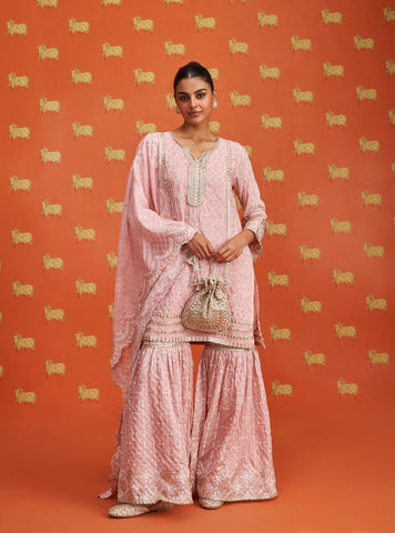 A Rich And Regal Black Kurta Set Featuring A Straight Kurta With Shararas. Executed In A Lustrous Fabric, The Kurta Features Traditional White Thread Embroidery All Over. The Notched Neckline Is Adorned With Gotta Details. The Sleeves And Hemline Are Decorated With Regal Gotta Panels And Embroidery. The Shararas Are Intricately Embroidered To Create A Festive Look.
