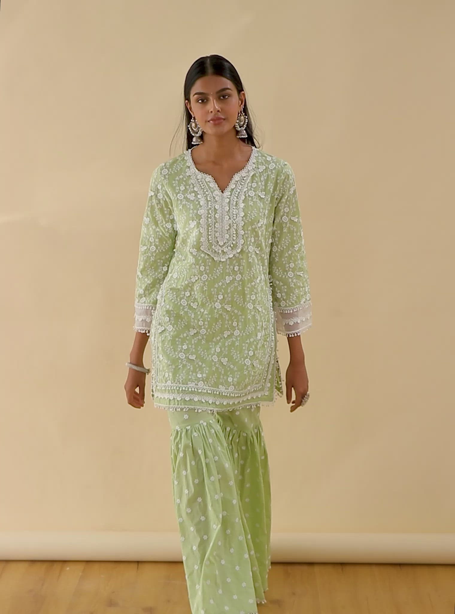The kanji set in the trending shade of green is a statement for the summer, featuring a short kurta with running floral embroidery enhanced by applique floral motifs, bell sleeves with organza panels, double lace trims, and hemline with minimal lacework to bring a balance. The set comes with a coordinated garara in green with tiny floral motifs.