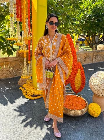 This Delightful Mustard Color Kurta Set Is A Celebration Of Feminine Grace And Traditional Artistry, Perfect For Any Festive Occasion Or Special Gathering. The Kurta Is Crafted In An Earthy Mustard, Featuring Floral Embroidery In White That Creates A Stunning Contrast Against The Background. The Classic V-Neckline Is Bordered With Intricate Gotta, Which Also Adorns The Front Placket. The Three-Quarter Sleeves Are Finished With The Same Gotta Detailing, Adding A Delicate Touch To The Ensemble.