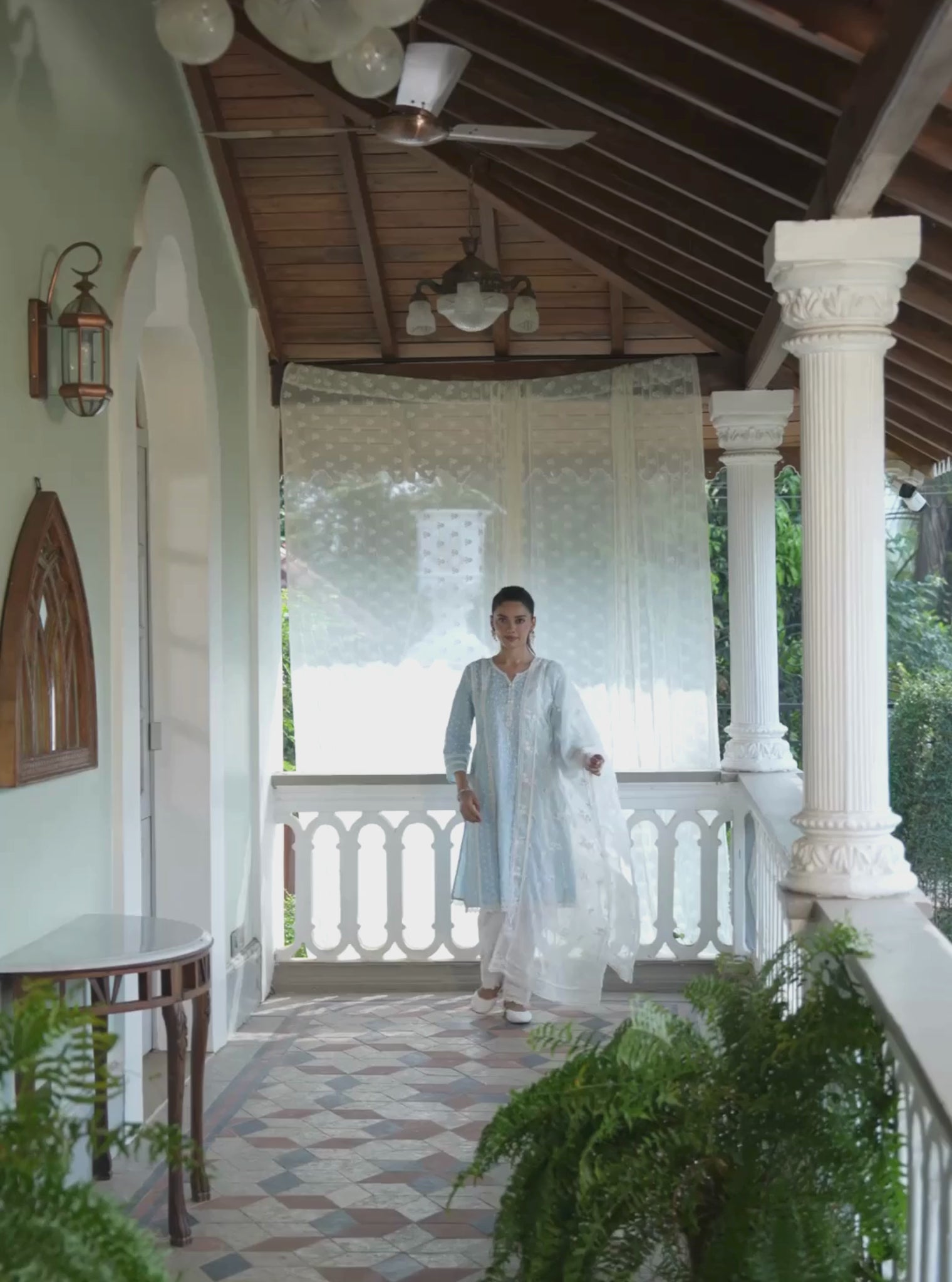 A Straight Kurta With Ladder Lace And Pearl Detailing On The Neck. Vertical Panel Detailing. Also Has A Geometric Lace Border At The Bottom. Cotton Dupatta With Panel Detailing And 3D Embroidery. Rounded Hem Straight Embroidered Cotton Pants With Lace Detailing.