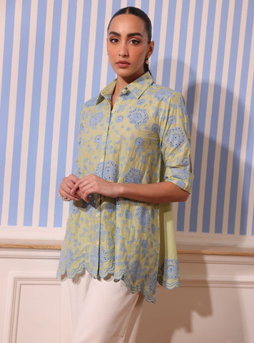 Made In Pure Cotton, The Design Features A Collared Neckline, Rolled-Up Sleeves, And An A-Line Silhouette That Flatters Every Form. The Scalloped Hemline Adds A Touch Of Whimsy, While The Intricate Threadwork Brings Timeless Floral Artistry To Life.