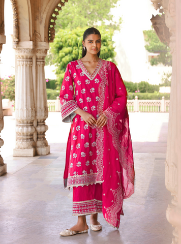 The Yalika Kurta Set In Denim Brings Bold Colour And Detailed Craft Together In A Statement-Worthy Silhouette. Cut In Breathable Cotton, The A-Line Kurta Features All-Over Booti Embroidery In Green And Ivory, And A Scalloped V-Neckline. The Full Sleeves Are Bordered With Intricate Gota Work, While The Hem Is Finished With Lace And Fringe Trims. Paired With Matching Cotton Pants And A Organza Dupatta In Tonal Blue And White With Scalloped Lace Edges; This One'S Made For The Spotlight.