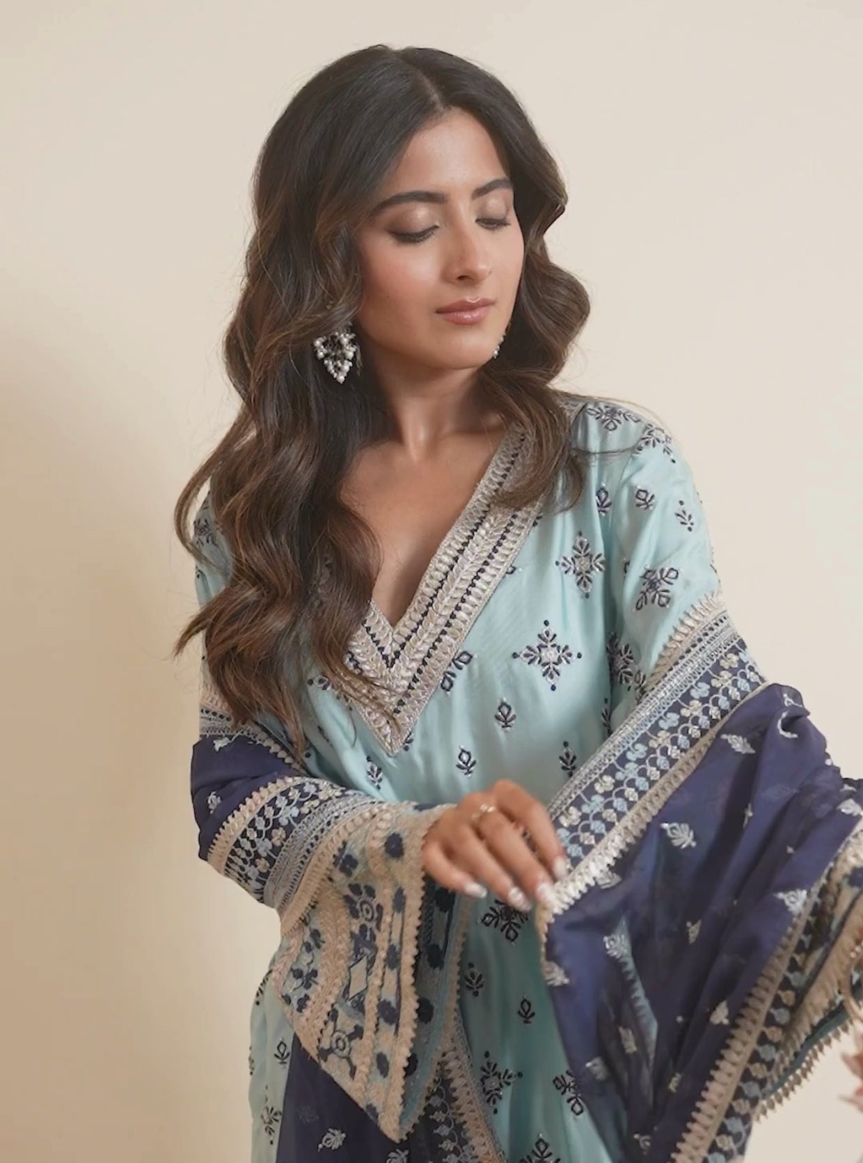 tep into regal elegance with this exquisitely crafted ensemble in a serene ice blue palette, paired with a striking navy dupatta. Tailored in lustrous satin fabric with a gentle sheen, this kurta set exudes understated festive sophistication. The A-line asymmetrical kurta is adorned with intricate floral thread embroidery.Beautifully adorned are the V-neckline and sleeves, delicately edged with gota lace.