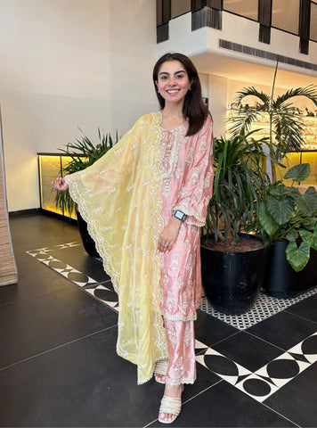 The Ensemble Is Completed With A Contrasting Dupatta In A Vibrant Yellow Hue. The Dupatta Is Generously Embroidered With White Threadwork, Creating A Striking Yet Subtle Contrast Against The?ÿKurta. The Scalloped Edging Adds A Touch Of Femininity And Grace.