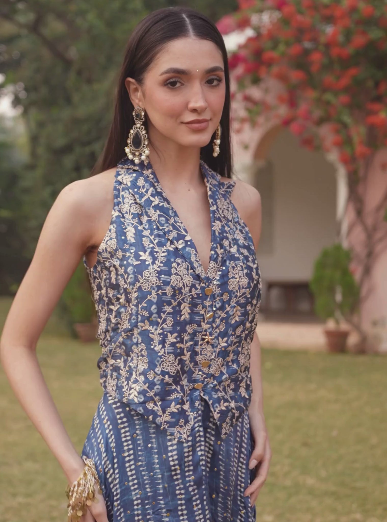 A coordinated waistcoat and skirt set in signature Badami print, cut in soft cupro satin for fluid drape and comfort. The sleeveless waistcoat is tailored for a flattering shape, offering structure without stiffness. It is paired with a sweeping, flared skirt that enhances movement and creates a balanced proportion.