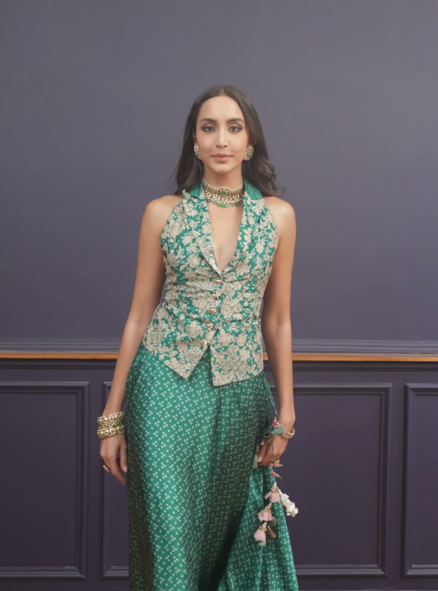 A Modern Spin On Traditional Festive Wear. This Emerald Green Cupro Satin Waistcoat Is Paired With A Flowing Skirt In Bandhni Inspired Print, Striking The Balance Between Structured And Fluid. A Standout Piece For Celebrations.