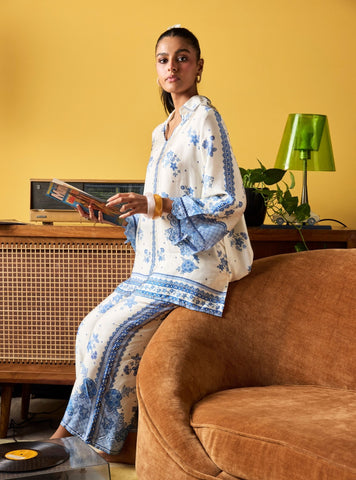 This Mehrang set features a soft blue print on breathable cupro satin, offering ease without sacrificing finish. Designed for long wear, the silhouette allows free movement while looking put-together. A versatile option for festive evenings, and coordinated dressing.