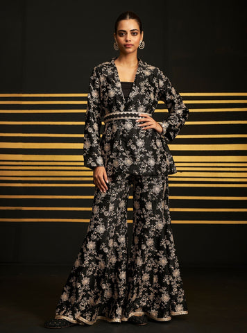 This Vibrant Co-Ord Set Radiates Festive Charm With Its Striking Fuchsia Base, Adorned With Intricate Gold Thread Floral Motifs. The V-Neckline And Cinched Waist Create A Flattering Silhouette, While The Flared Pants Add A Touch Of Drama To The Ensemble. Perfect For A Sangeet Or A Lively Wedding Function, This Outfit Balances Tradition With A Modern Twist. The Detailed Embroidery And Flowing Fabric Make It A Show-Stopping Choice For Any Celebration, Ensuring You Stand Out In Style And Elegance.
