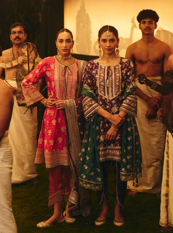 This A-line kurta set is crafted in softest cupro satin, detailed with intricate embroidery. Paired with dhoti-style satin pants and a flowing black organza dupatta, it’s a bold yet timeless choice for festive evenings.