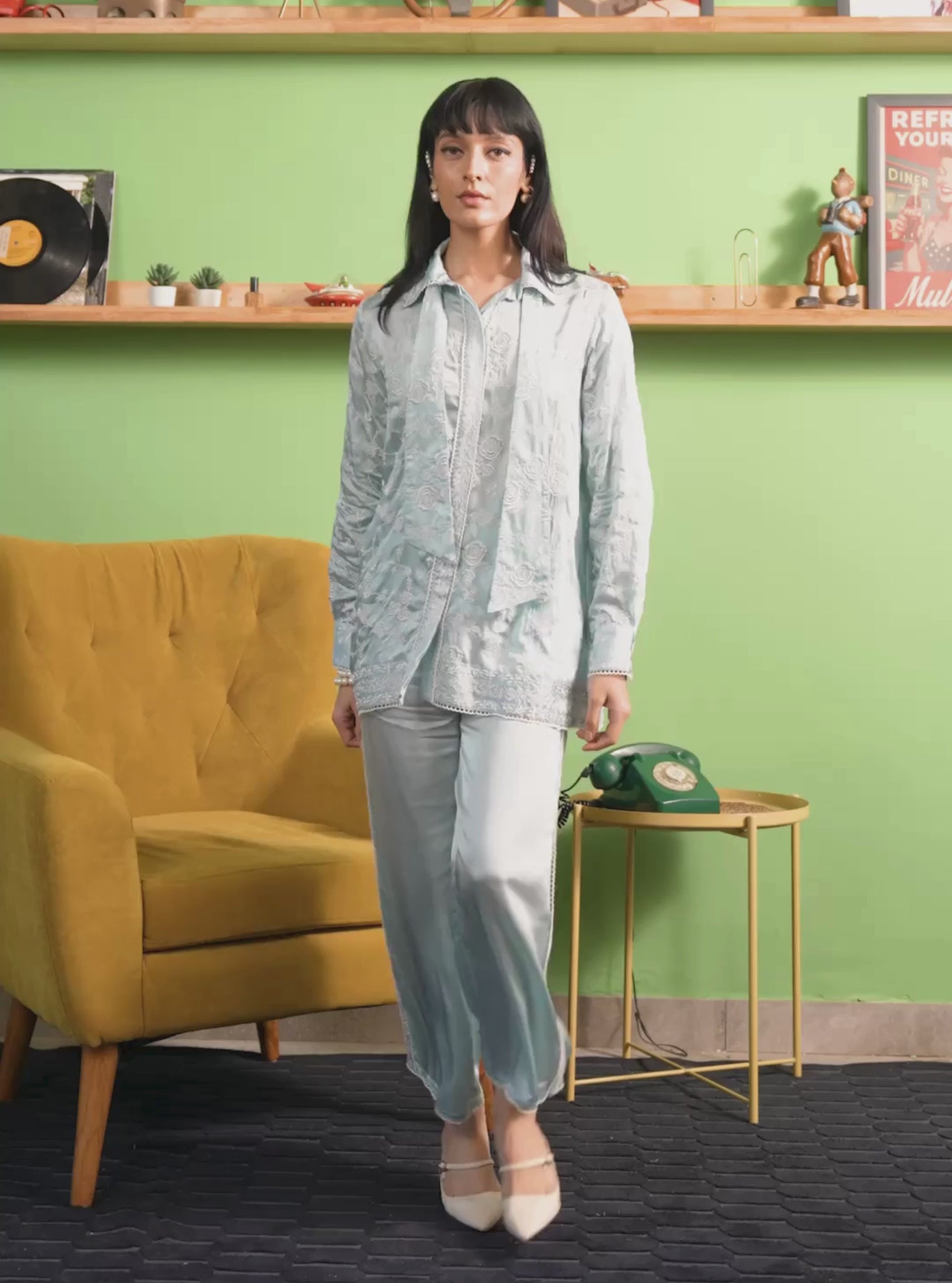 This cupro satin shirt set is designed for movement and modern dressing. The smooth, breathable fabric gives the silhouette a soft structure, while the clean tailoring keeps it versatile across occasions. Easy to style together or as separates, it’s a set that works from intimate celebrations to formal festivities.