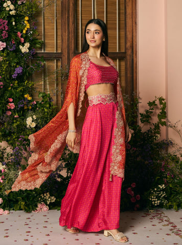 Contrasting festive set with sheer cape and satin pant construction. Structured blouse provides fit support. Lightweight layers allow ease of wear through long events. Suitable for haldi, mehendi, and daytime weddings.