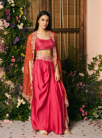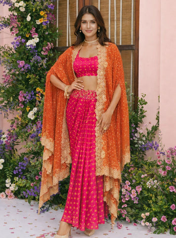 Contrasting festive set with sheer cape and satin skirt construction. Structured blouse provides fit support. Lightweight layers allow ease of wear through long events. Suitable for haldi, mehendi, and daytime weddings.