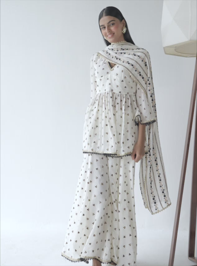 A Beautiful Georgette Set For Any Joyous Occasion And Festivity, With Contrasting Black Embroidery On The Over All. The Off-White Colour Choice Gives An Extra Visual Pleasure And A Classic Outlook To This Piece. A Desirable Kurta Set For Any Big Or Small Affair.