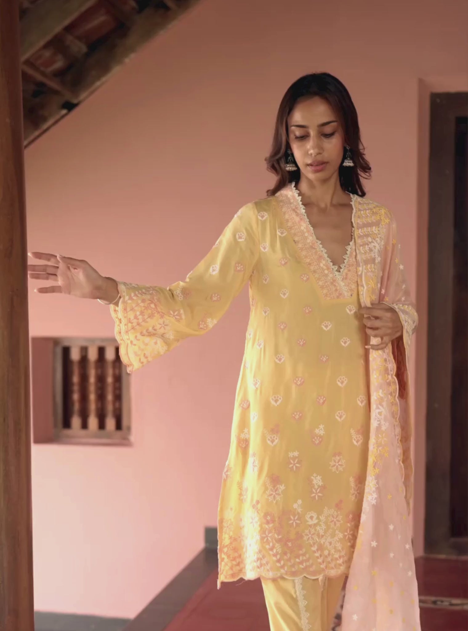 Soft As A Summer Breeze And Radiant As The Morning Sun, This Pastel Yellow Kurta Set Is Designed To Elevate Your Everyday Ethnic Wardrobe. The A-Line Kurta Features Delicate Floral Threadwork Scattered Across The Body, With Intricate Detailing Along The Scalloped V-Neckline And Cuffs, Adding A Romantic Touch To Its Breezy Silhouette.