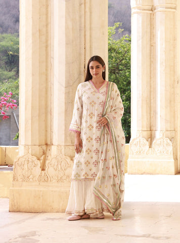 It’S Paired With A Flared Sharara, Embroidered At The Hem To Echo The Kurta’S Charm. The Printed Dupatta, Light And Flowy, Finished With Fine Lace—Adds A Breezy Layer To Tie The Whole Ensemble Together.
