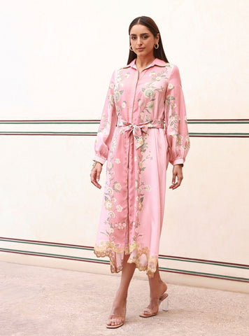 The Ilona dress is crafted soft, airy lawn fabric. It has a shirt-style collar, full sleeves, and a flowy shape that feels easy to wear. The dress is covered in pretty floral designs, placed neatly along the edges.