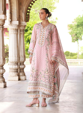 Cool And Composed, The Olisha Denim Kurta Set Is Crafted In Soft Lawn Fabric And Printed With Floral Vines, Dainty Trellises, And Striped Panels. The Kurta Features A Mirror-Embellished Neckline And A Relaxed Straight Silhouette, Making It A Breeze For Warm Festive Days. Sleeves Are Detailed With Contrast Borders And Delicate Lace, Finished With Beaded Tassels For That Extra Something. Paired With Matching Lawn Pants And A Sheer Organza Dupatta Featuring Digital Florals And Scalloped Lace Borders, This Set Is Light, Easy, And Effortlessly Elegant.