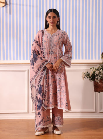 A Poetic Ode To Florals, This Powder Blue Kurta Set Is A Delicate Blend Of Elegance And Ease. Adorned With Serene White And Green Botanical Prints, Accentuated With Embroidery, The Kurta Features A Relaxed Silhouette With A Notched Neckline And Fine Lace-Trim Detailing That Frames The Yoke And Sleeves. Paired With Straight Pants And A Matching Dupatta With Dainty Lace Edges And Bordered With Florals, This Ensemble Is Effortlessly Graceful. The Fluidity Of The Fabric And The Harmony Of Color Make It A Charming Pick For Day Gatherings, Festive Brunches, Or Intimate Celebrations.