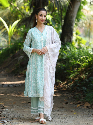 The A-Line Kurta Is Paired With Straight-Fit Pants Featuring Lace Inserts At The Hem. The Matching Dupatta, Adorned With White Embroidered Motifs And A Scalloped Border, Drapes Effortlessly To Complete The Look. Ideal For Daytime Celebrations And Garden Parties, This Kurta Set Is A Celebration Of Summer Charm With Its Vibrant Hue And Exquisite Detailing.