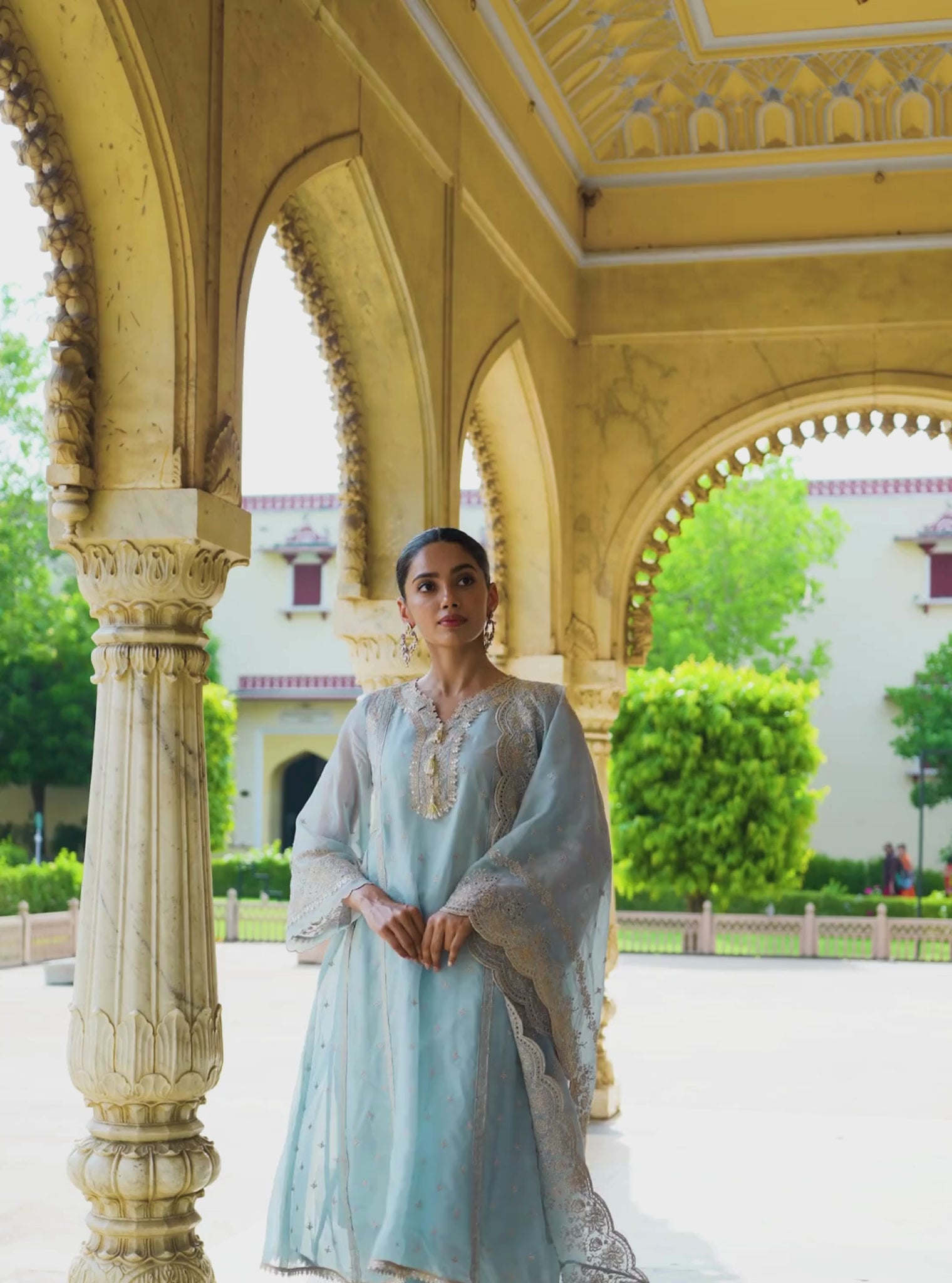 Paired with tonal cotton pants embroidered at the hem, the look stays cohesive and polished. The organza dupatta completes the ensemble with embroidered scallops and fine lace edging—light as a breeze, yet rich in detail.
