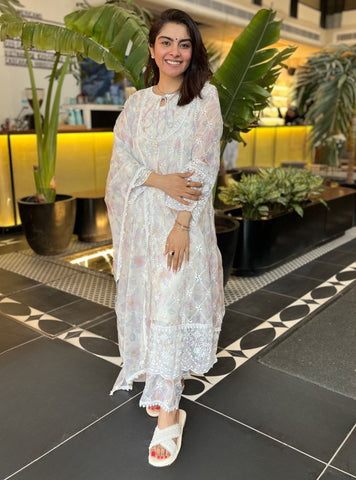 The Hemline Of The Anarkali Is Delicately Trimmed With Scalloped Lace. Complementing The Ensemble Are Straight Bottoms With An Embroidered Organza Panel. Complete Your Ensemble With The Ethereal Touch Of The Accompanying Organza Dupatta.