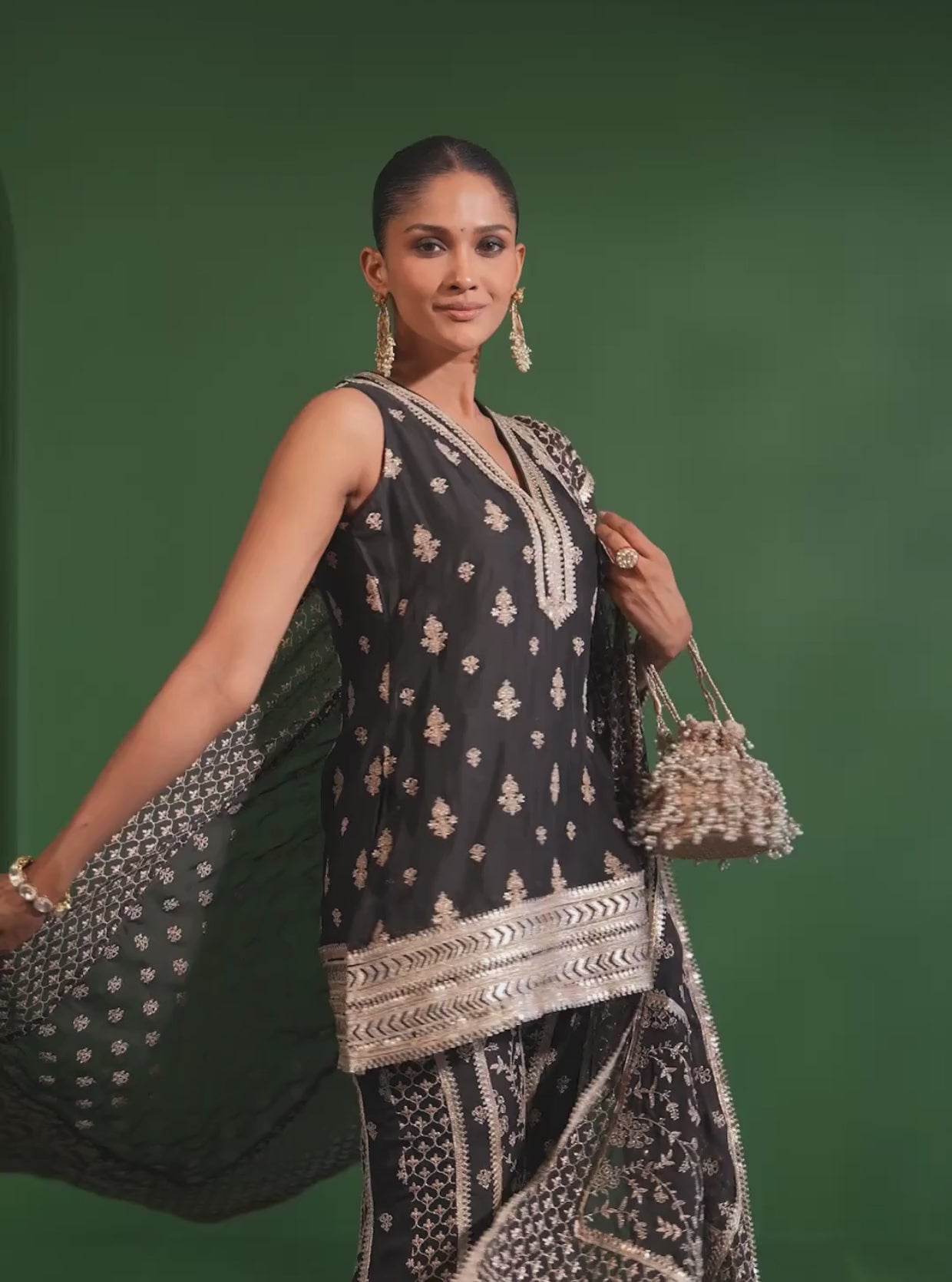 Drenched in the timeless allure of black, this embroidered sharara set is a captivating blend of tradition and contemporary elegance. The sleeveless short kurta is adorned with delicate white thread embroidery, and a gracefully embellished neckline that makes this ensemble a statement choice for festive and wedding occasions.