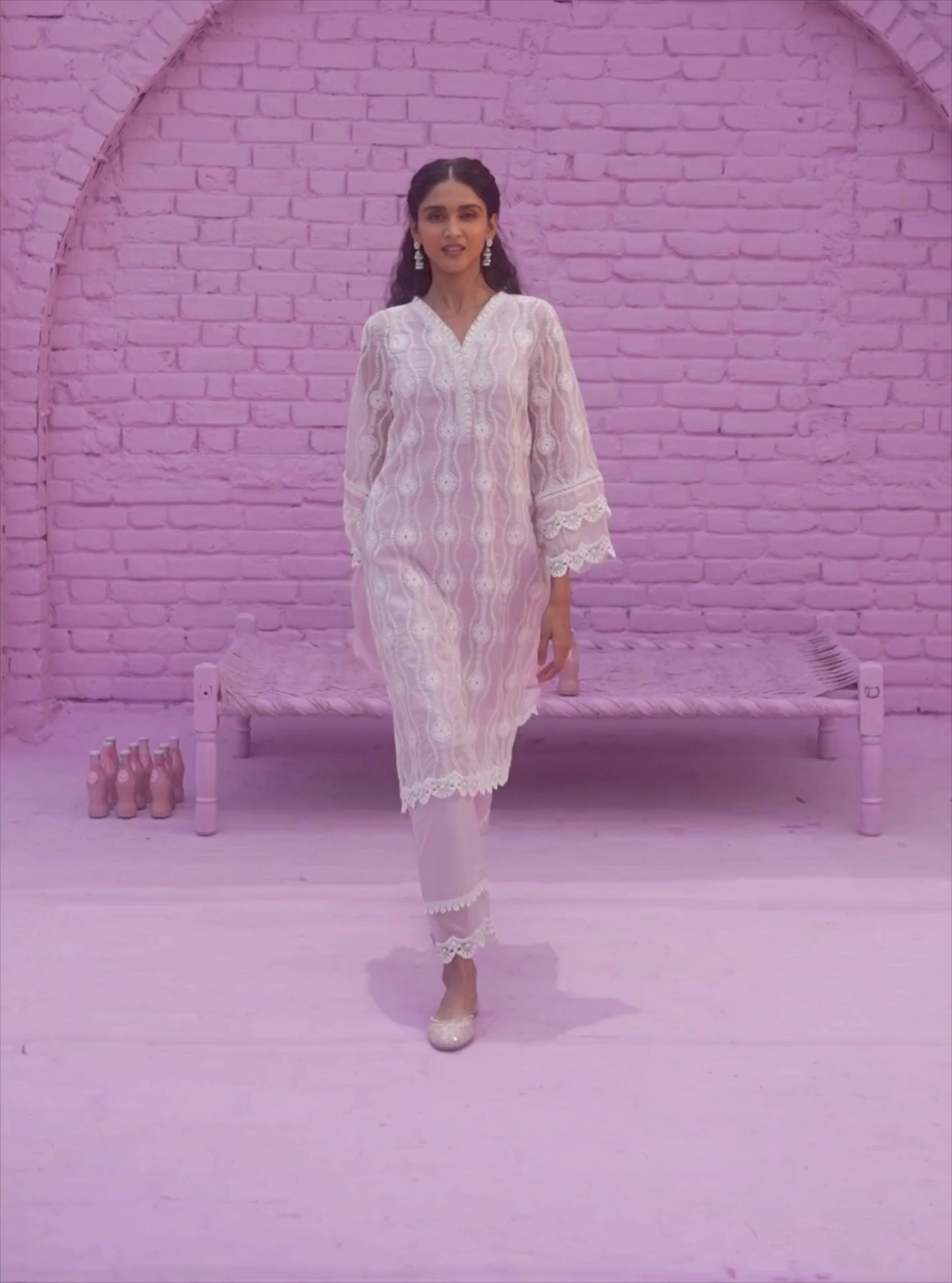 A stunning and delicately feminine pink kurta set, executed in breezy organza. The classic V-neckline of the kurta is adorned with floral lace trim. The slightly flared, multi-tiered sleeves have a scalloped lace edge, like the hemline. The entirety of the straight kurta features eyelet embroidery in white thread, that creates a subtle contrast against the base. The kurta is paired with straight pants, featuring a sheer lace-trimmed panel at the hem. Finish the look with a 3D floral embroidered dupatta to match.