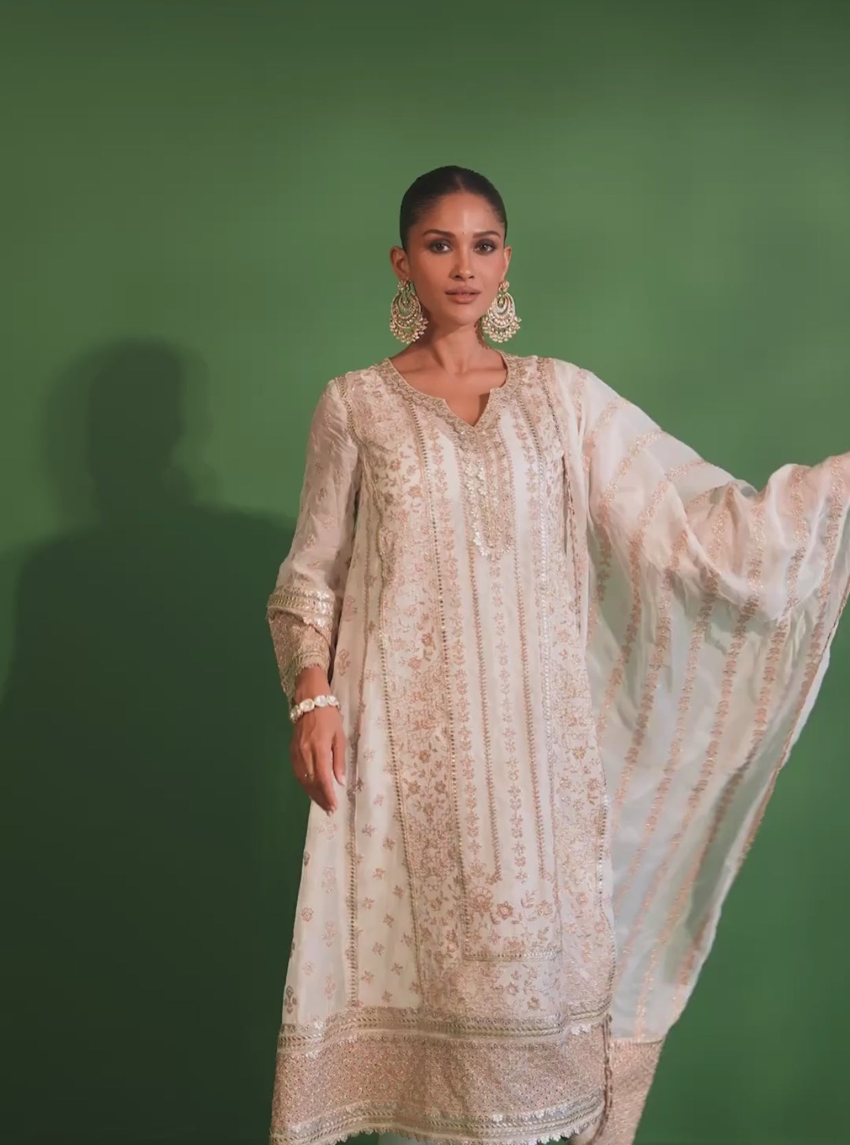 A timeless classic, this ivory Anarkali set is the epitome of regal grace. The flowing silhouette of the Anarkali, adorned with intricate golden threadwork and floral motifs on the sleeves and hemline, is a stunning showcase of traditional designs.