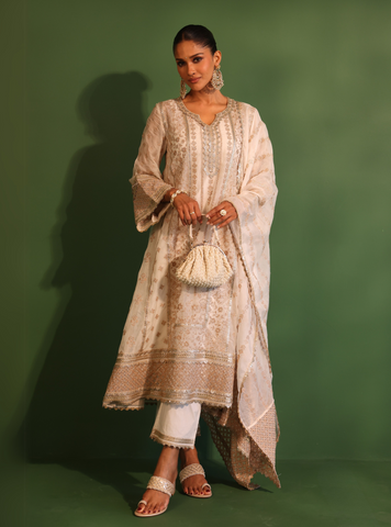 A Timeless Classic, This Ivory Anarkali Set Is The Epitome Of Regal Grace. The Flowing Silhouette Of The Anarkali, Adorned With Intricate Golden Threadwork And Floral Motifs On The Sleeves And Hemline, Is A Stunning Showcase Of Traditional Designs.