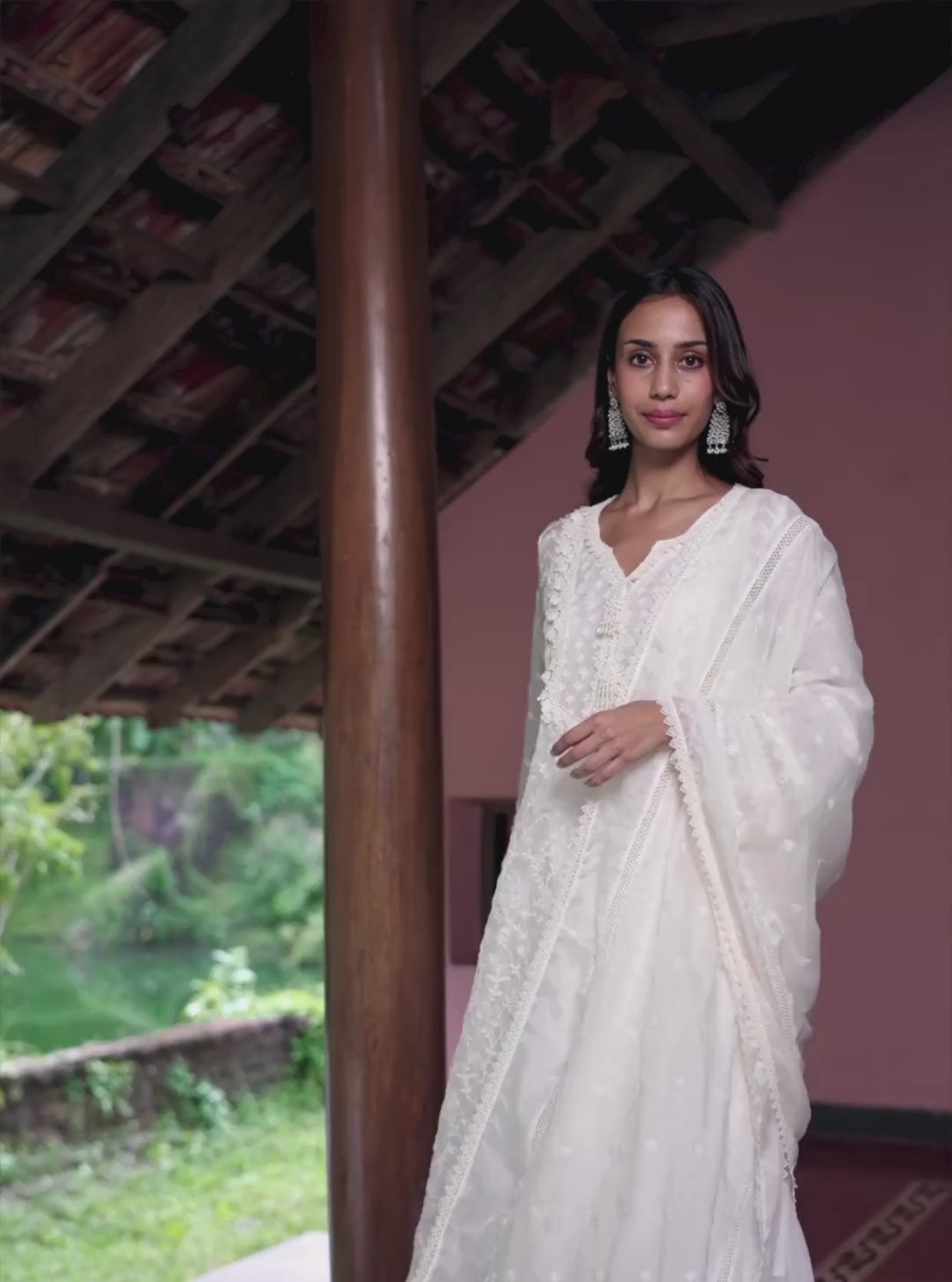 Timeless and ethereal, this white Anarkali kurta set is a celebration of understated elegance. Crafted from a breathable, lightweight organza, the flowing silhouette drapes effortlessly, offering both grace and comfort. The kurta is adorned with alternating panels of intricate self-toned white embroidery, creating a delicate textural play. Thoughtfully placed lace accents along the V-neckline, sleeves, and hem enhance the overall charm, while the flared cut adds movement, making it a perfect choice for effortless elegance.