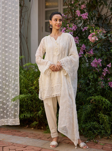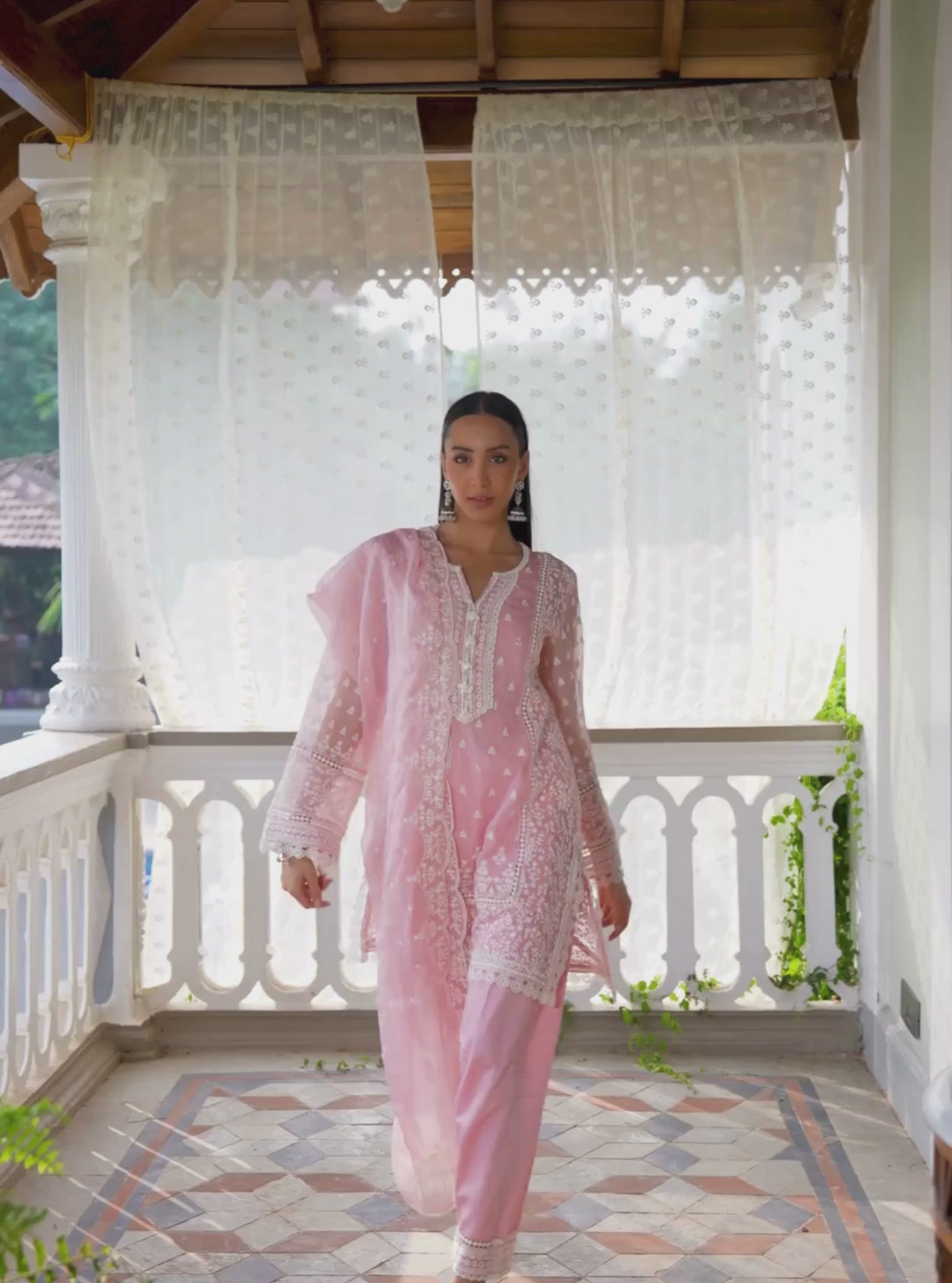 The Meyo Kurta Set is crafted in sheer organza and designed in a relaxed straight silhouette. The kurta features delicate embroidery and refined border detailing, paired with comfortable KLF satin pants that balance the lightness of the organza fabric. A coordinated organza dupatta completes the look with a graceful drape.