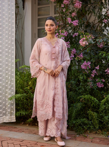 Crafted in sheer organza, the Miso Kurta Set features a straight kurta with delicate embroidery and refined borders. It is paired with comfortable satin pants that balance the lightness of the organza while maintaining structure. The coordinated organza dupatta completes the ensemble with an airy drape.