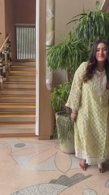 This Anarkali set in a delicate shade of lime is what fairy tales are made of! The round neckline of the kurta features a tie-up detail, while the yoke is adorned with multiple layers of lace. The entirety of the kurta is covered in jaali embroidery in a subtly contrasting white thread. The slightly flared sleeves have multiple layers of lace, while the hemline is heavily adorned with intricate floral lace. Paired with the kurta are straight pants with lace trim at the cuff. Finish this dreamy ensemble with the matching dupatta, featuring a floral lace border.