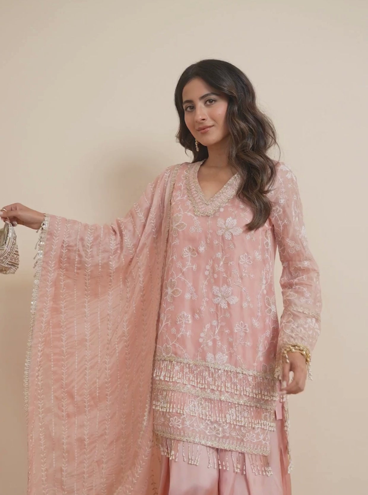 Paired with wide-legged sharara pants in matching pink, the silhouette offers both comfort and statement-making elegance. The dupatta matches the kurta's rich embroidery and fringe accents, creating a cohesive and opulent look.