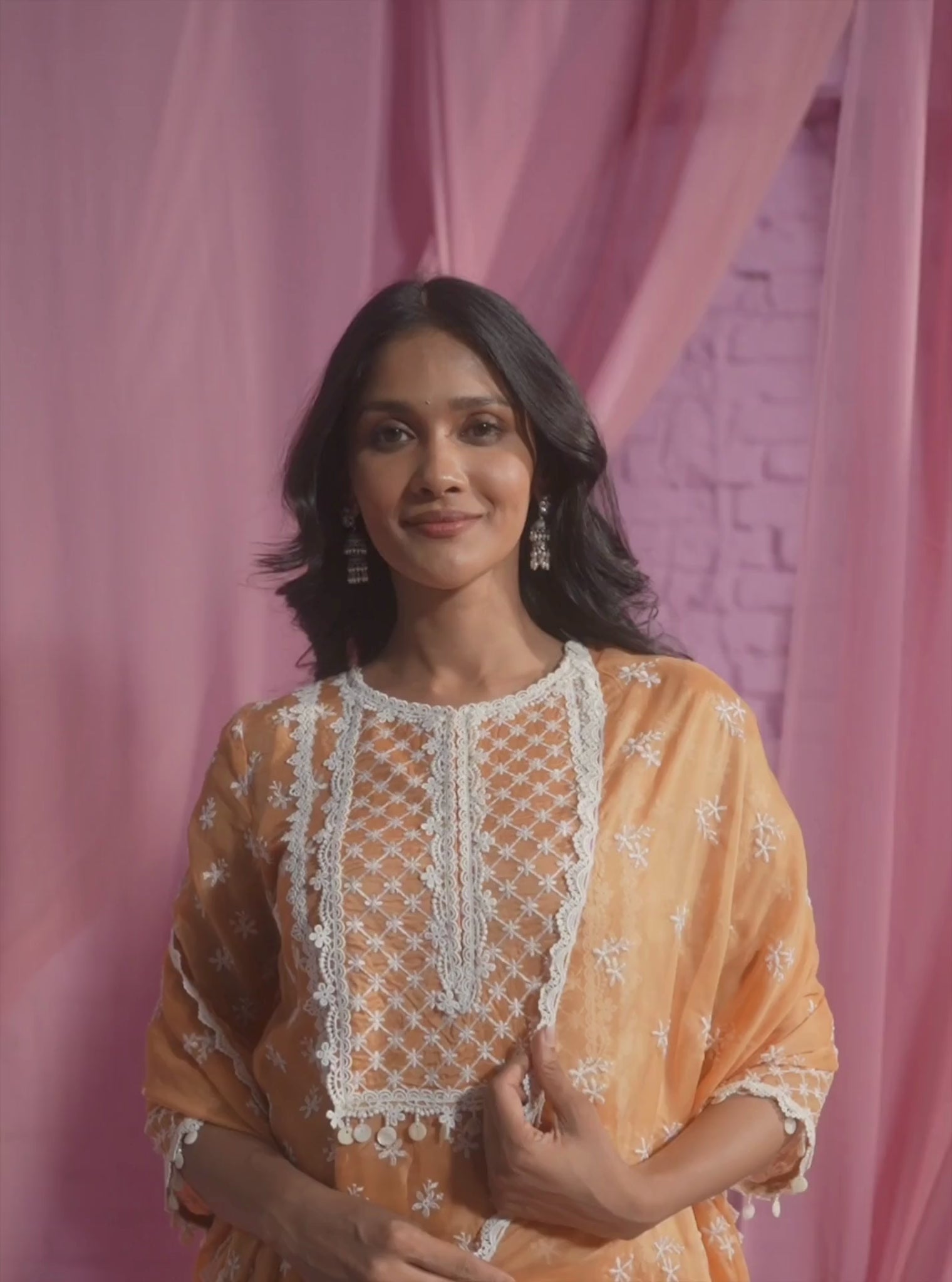 This Vibrant Orange Kurta Set Features A Charming Short Kurta Adorned With Delicate White Embroidery And Lace Detailing. The Kurta Boasts A Straight Cut With A Modest Round Neckline, Highlighted By Intricate Lacework That Extends Down The Yoke. Accompanying The Kurta Is A Pair Of Wide-Legged Palazzo Pants, Also Decorated With Matching Embroidery And Lace At The Hem, Creating A Cohesive And Graceful Ensemble. The Set Is Completed With A Graceful Dupatta, Draped Effortlessly And Featuring Intricate Embroidery That Mirrors The Kurta'S Design, Enhancing The Overall Aesthetic.