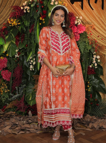 Paired With Matching Maroon Trousers, Featuring Embroidered Hemlines, This Ensemble Exudes Sophistication. Thedupatta, With Its Dainty Gottadetailing, Completes The Look, Making It Ideal For A Sangeet Or Mehendi Ceremony. Embrace The Vibrant Hues And Let Your Style Speak At Every Wedding Event.