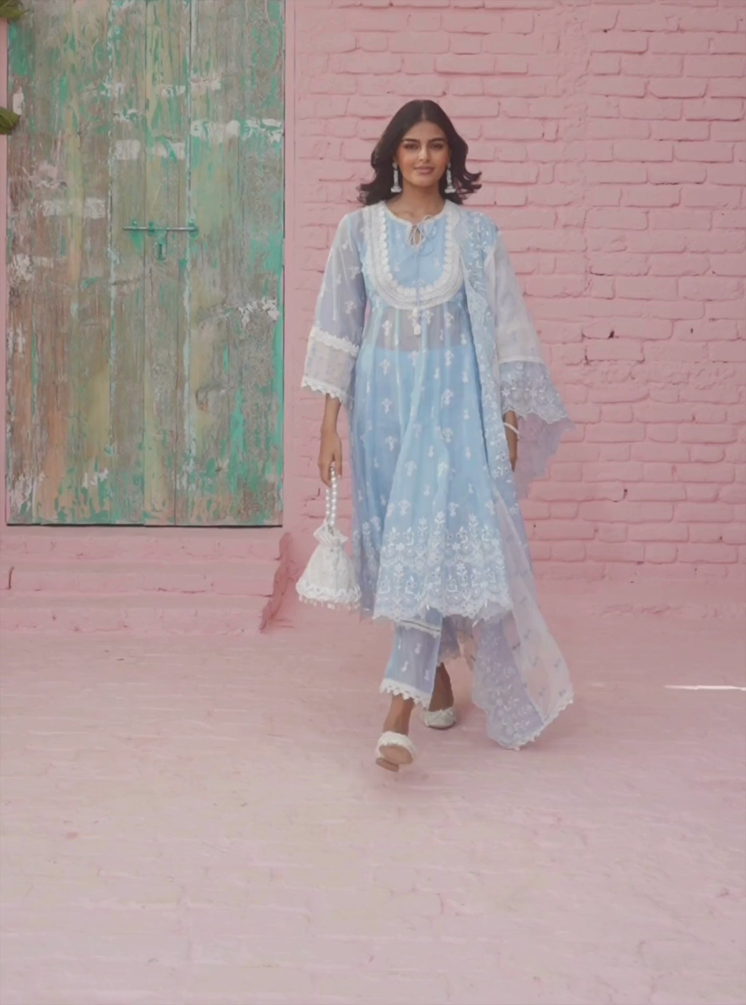 A feminine organza Anarkali in a serene shade of blue. The kurta features a round neckline with a tie-up detail and a lace-adorned yoke. The sleeves also feature delicate lace trimmings, and the entirety of the kurta is covered with white thread floral embroidery. The hemline is scalloped with intricate embroidery and dainty pearl hangings. Pair the kurta with straight pants with an embroidered organza panel at the hem. The delicate contrasting dupatta in white features blue floral embroidery, completing the ensemble with elegance, .