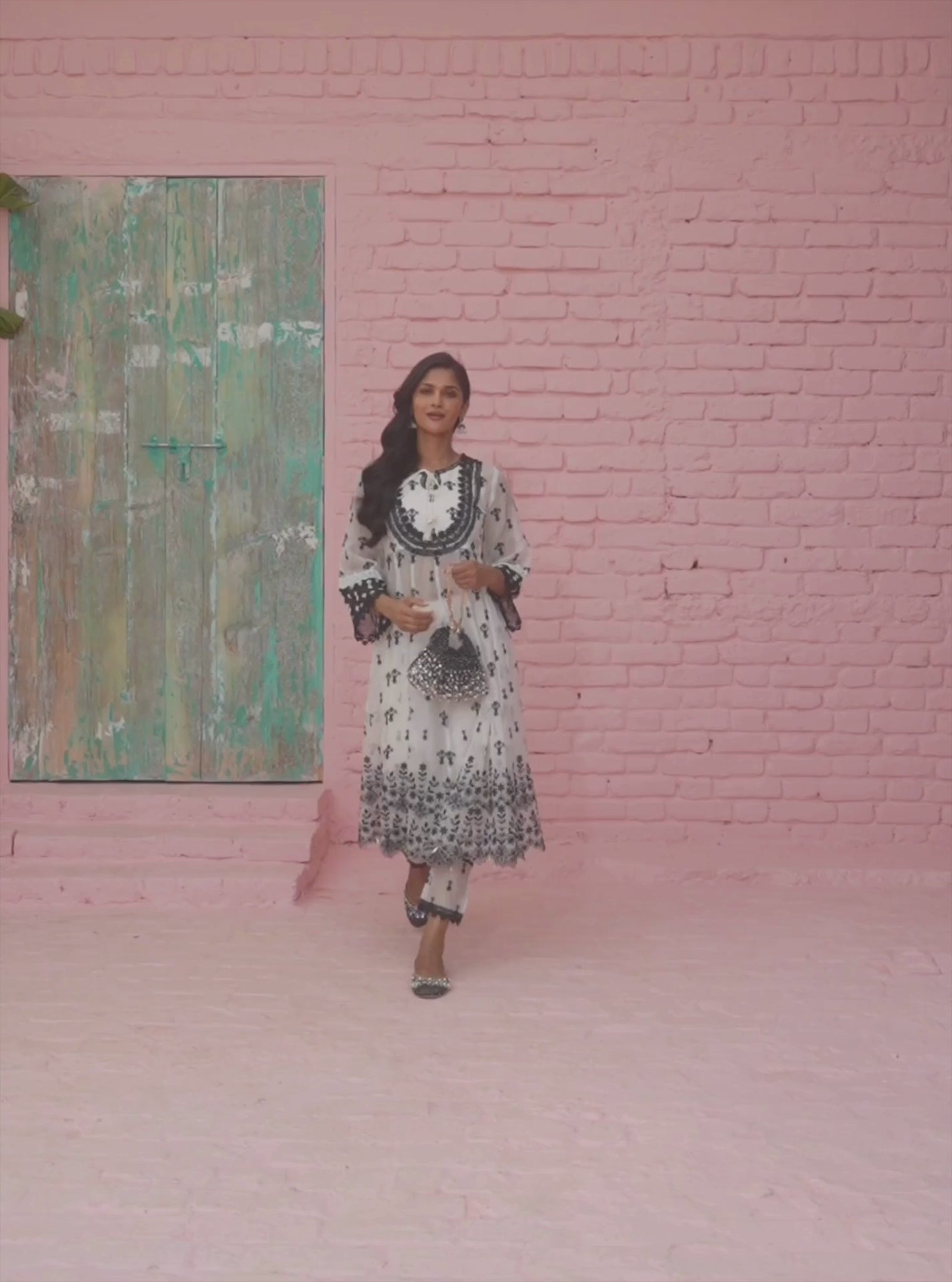 A stunning Anarkali in a classic black-and-white combination. The kurta features a round neckline with a tie-up detail and a lace-adorned yoke. The sleeves also feature delicate lace trimmings, and the entirety of the kurta is covered with black thread floral embroidery, contrasting stunningly against the white base. The hemline is scalloped with intricate embroidery and dainty pearl hangings. Pair the kurta with straight pants with an embroidered organza panel at the hem. The delicate contrasting dupatta in black features white floral embroidery, completing the ensemble with elegance,.