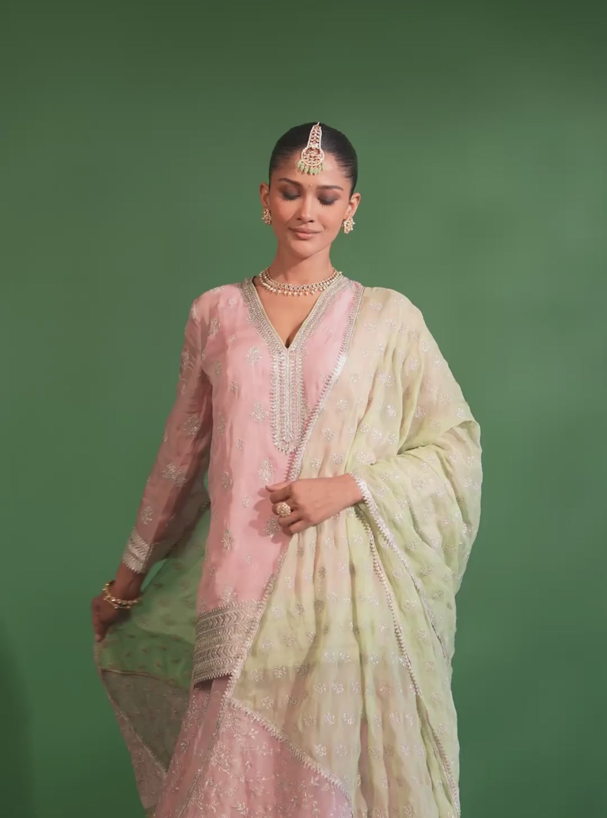 Completing the set is a sage green dupatta, a refreshing contrast to the blush palette. Adorned with delicate embroidered motifs and a finely detailed border, the sheer drape adds a layer of sophistication and lightness to the look.