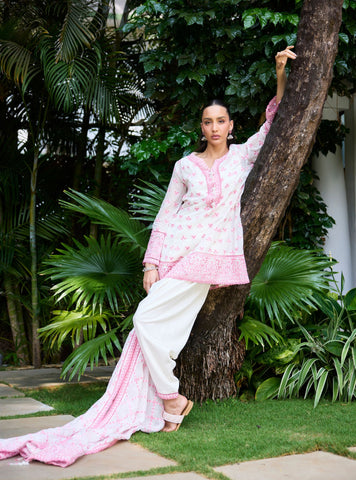 The Taroa Kurta Set is crafted in lightweight organza and designed in a relaxed straight silhouette. The kurta features subtle detailing and is paired with fluid KLF satin salwar pants that provide comfort and ease of movement. The coordinated organza dupatta completes the look with an elegant drape.
