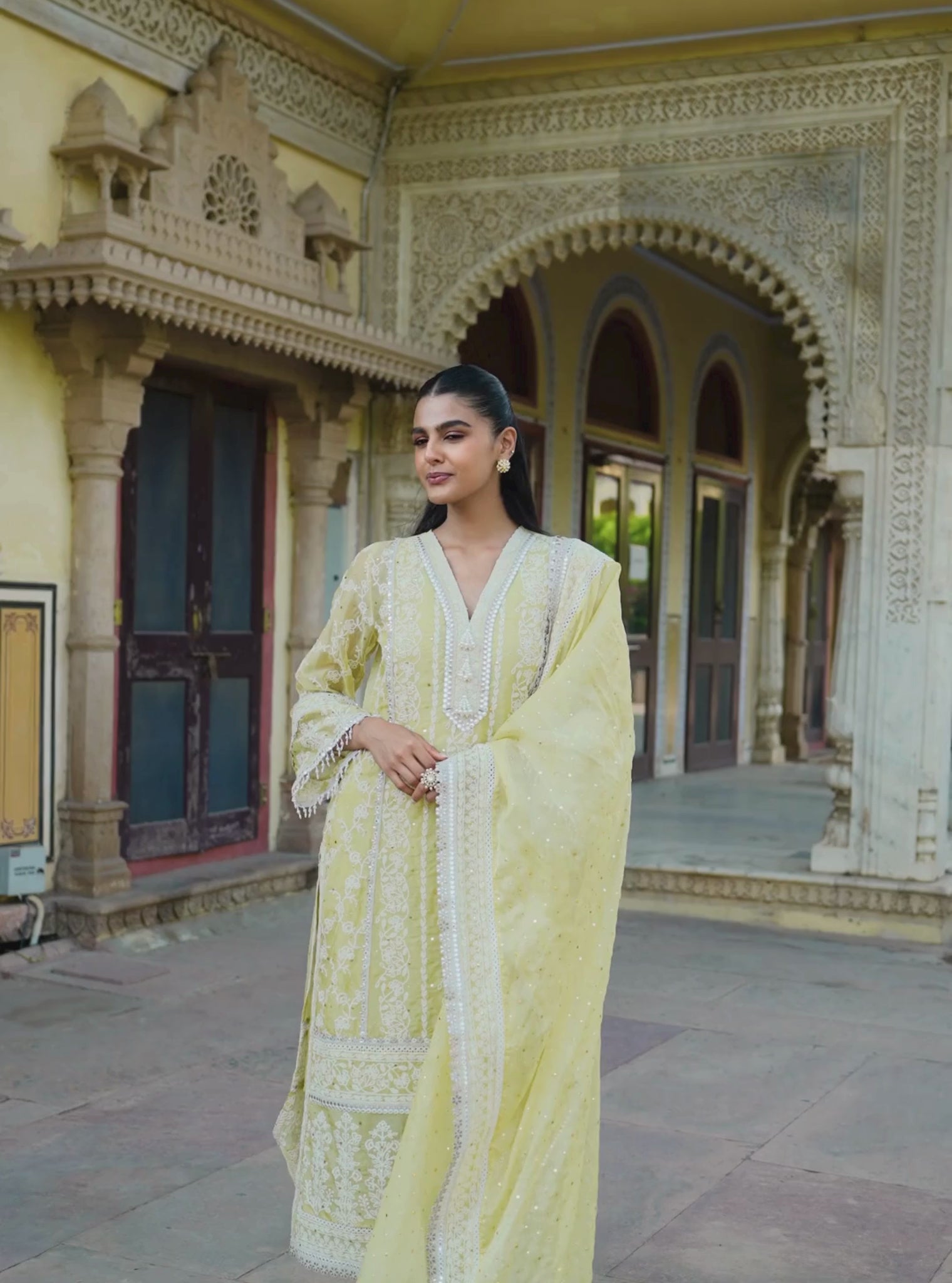The Taveya Kurta Set brings a burst of brightness in a refreshing lime hue, tailored in a flattering straight silhouette. Crafted in sheer organza, the kurta is delicately embroidered with thread and sequin motifs that catch the light with every move. The soft V-neckline and full sleeves add a touch of modern ease and elegance.