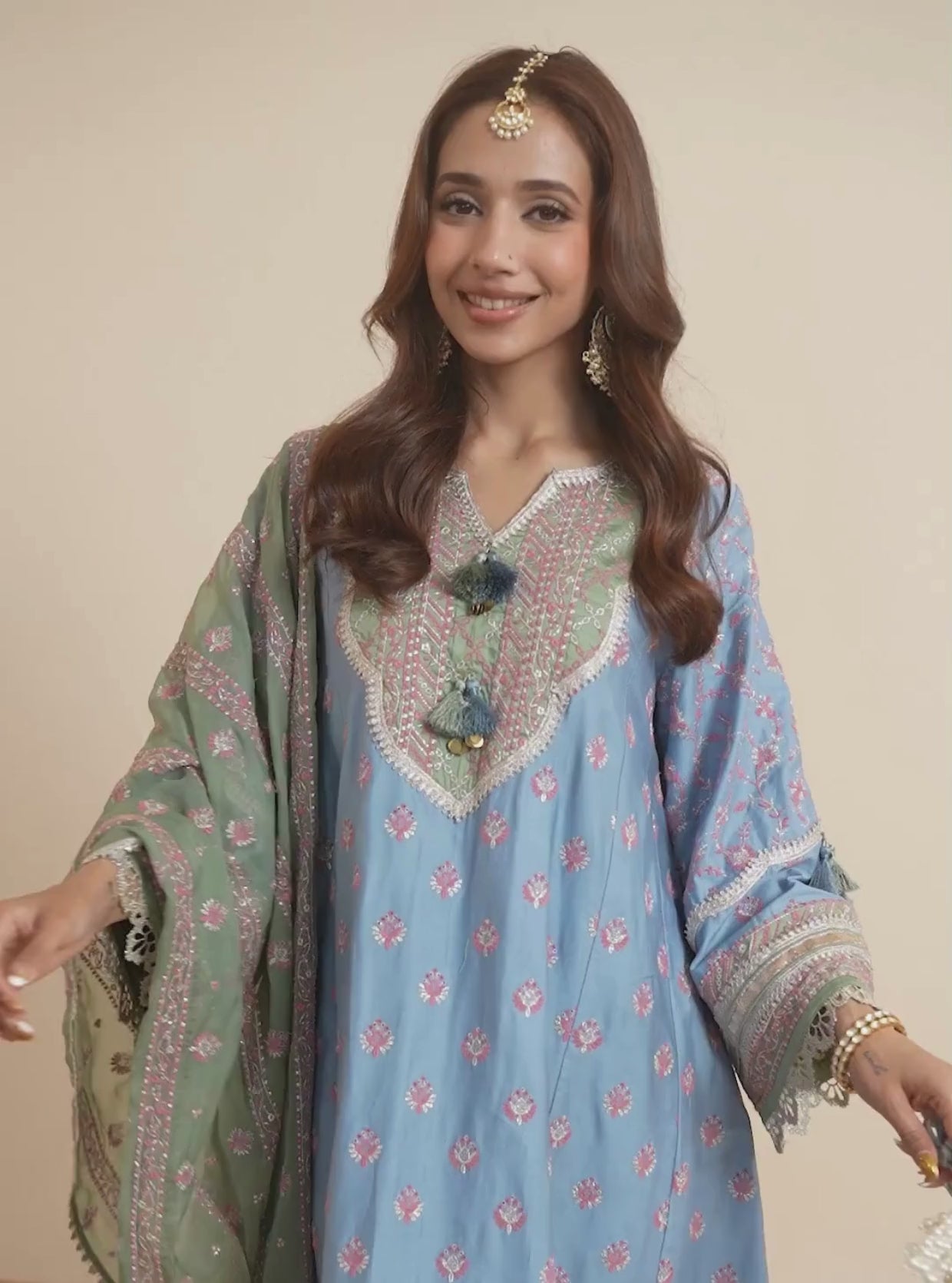 Gracefully striking the balance between tradition and charm, this powder blue ensemble is a celebration of soft femininity. The kurta features intricate floral embroidery, while intricate lace detailing on the sleeves and hem adds an air of vintage elegance. Paired with tonal pants and a contrasting pastel green dupatta adorned with fine floral patterns and chevron borders, this look is ideal for intimate wedding functions or daytime festivities.