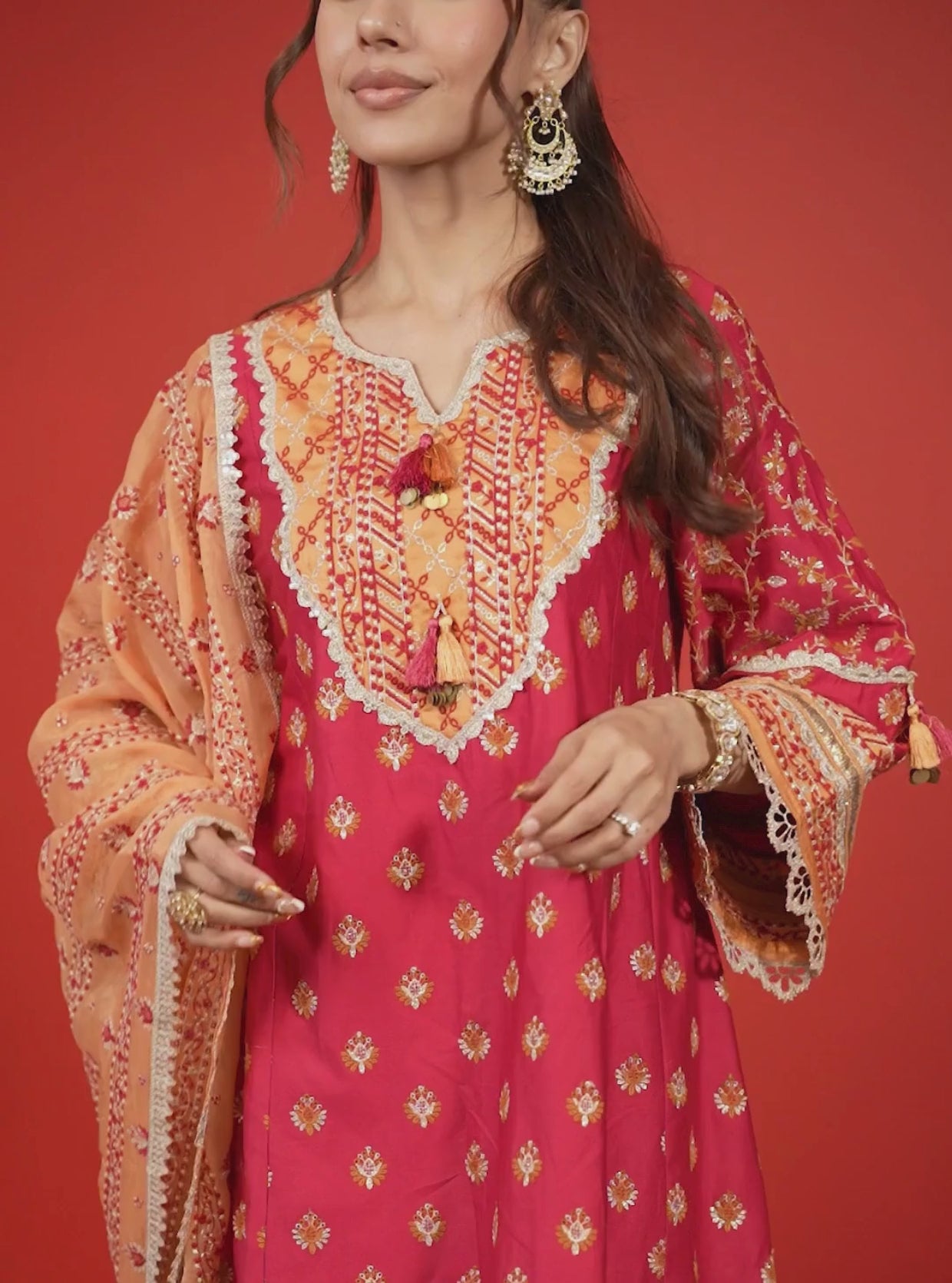 Unapologetically festive and beautifully bold, this deep red and orange embroidered suit is an exquisite ensemble for intimate wedding moments and vibrant rituals. The deep red kurta features intricate threadwork in rich tones, while the contrasting orange yoke panel adds a dash of traditional vibrance. Scalloped lace detailing on the sleeves and hemline heightens its ethnic charm. The ensemble is completed with solid red trousers and a beautifully embellished orange dupatta with zari motifs and chevron borders—perfectly balancing tradition with visual drama.